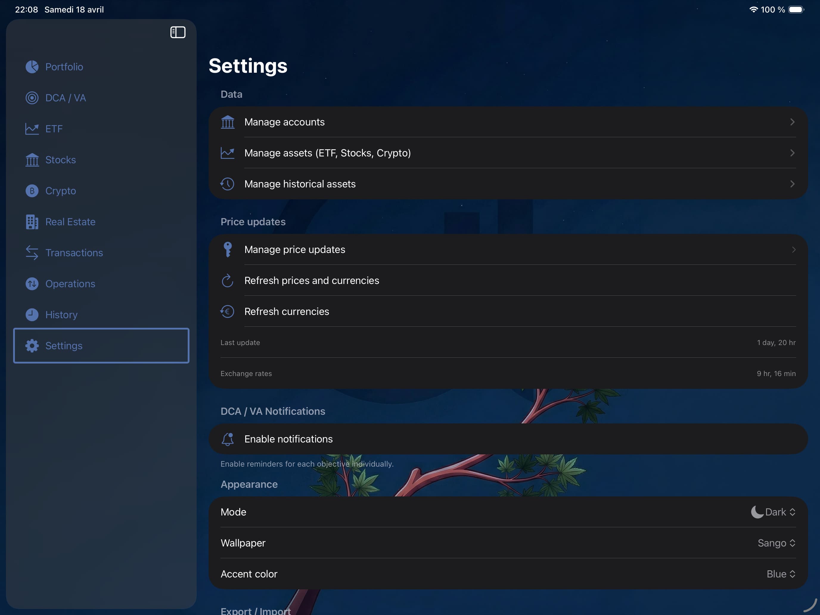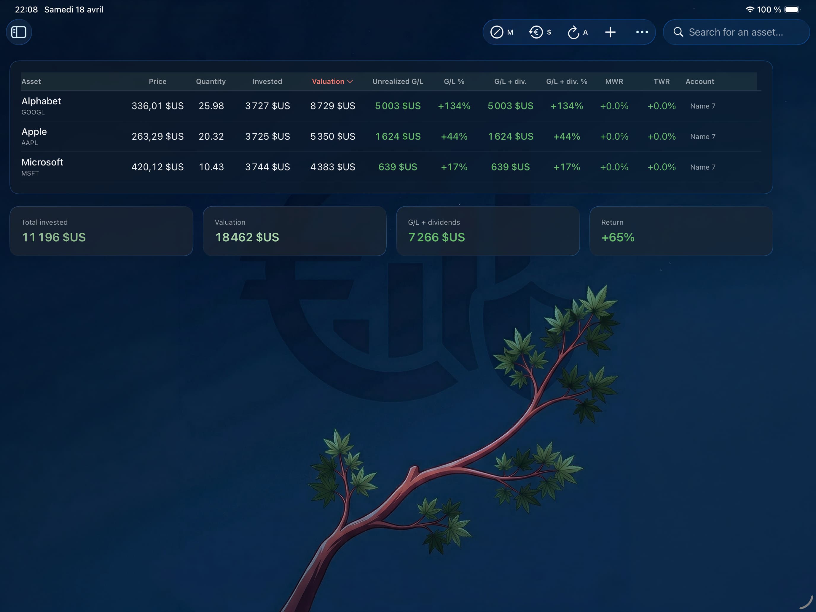 Experience day, night, seasons wallpapers, to follow your Sango Kaku's growth. Choose your country, language, currency. Export/import your data. Securely configure your API key or manually update your stocks prices.